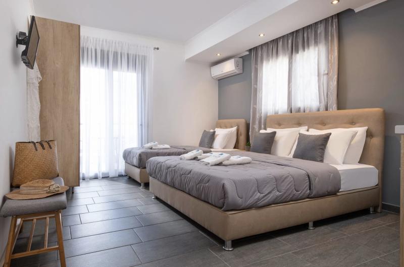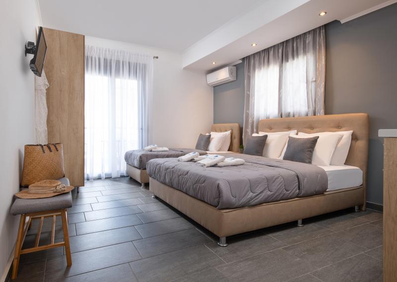 he Eolica Rooms is a fresh and elegant accommodation. It is located just one breath away from Sarti Beach (50 meters) and 5 minutes from the central market area of shops and taverns. Its location thus combines quietness, but without being cut off from the secular sites of Sarti. Sarti, built amphitheatrically between mountain and sea, is the most relaxing and idyllic destination of Halkidiki. The glistening blue sky is reflected in the sparkling, clear waters of Sithonia and Eolica was built right where everything means summer.